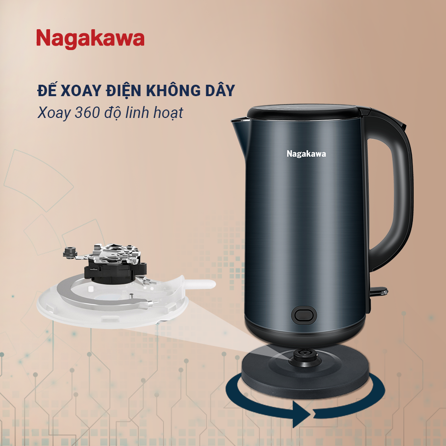 Ấm siêu tốc thủy tinh Nagakawa NAG0319 có đế tiếp điện xoay 360 độ tiện lợi, dễ dàng xoay nhiều góc độ khi sử dụng.