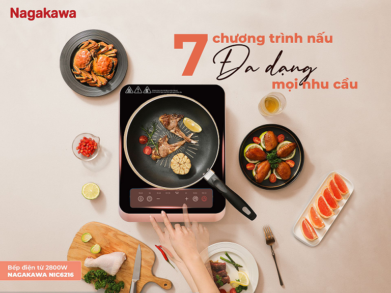 Bếp điện từ 2800W Nagakawa NIC6216 hỗ trợ 7 chế độ nấu ăn tiện lợi như chiên, xào, nấu lẩu, hầm cháo, đun nước… được thiết lập sẵn trên bảng điều khiển cảm ứng hiện đại. Người dùng chỉ cần một thao tác chạm để chọn chế độ phù hợp, nấu ăn nhanh chóng và đơn giản hơn bao giờ hết. Ngay cả ông bà hay trẻ lớn cũng dễ dàng sử dụng mà không gặp khó khăn.