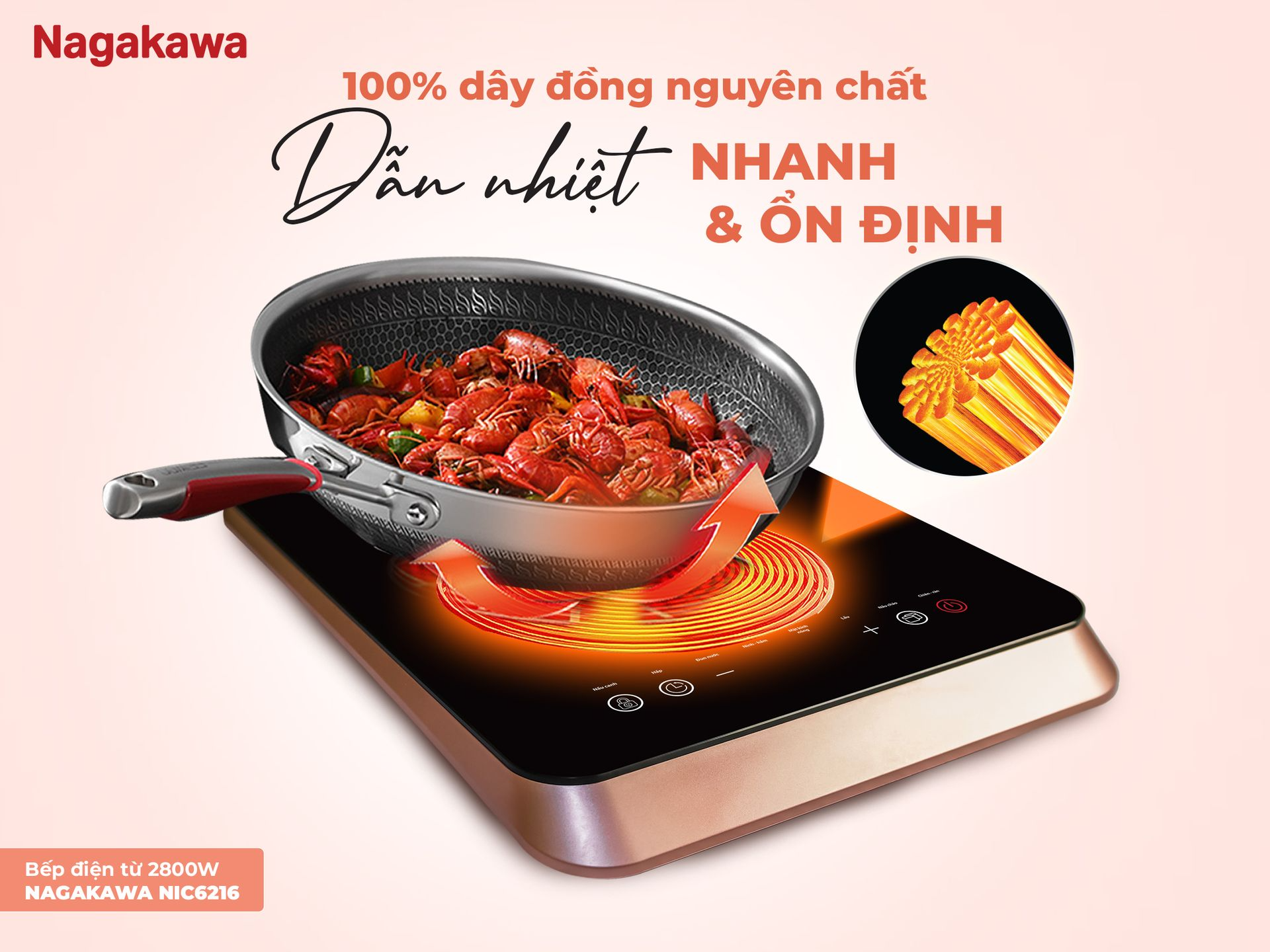 Bếp điện từ 2800W Nagakawa NIC6216 sử dụng mâm từ 100% dây đồng nguyên chất, đảm bảo hiệu suất truyền nhiệt cao, ổn định và bền bỉ. Nhờ vậy, quá trình nấu nướng luôn nhanh chóng, ít hao phí điện năng, giúp tiết kiệm chi phí sinh hoạt. Đồng thời, chất liệu đồng cao cấp cũng góp phần kéo dài tuổi thọ cho sản phẩm, mang đến sự an tâm khi sử dụng lâu dài.