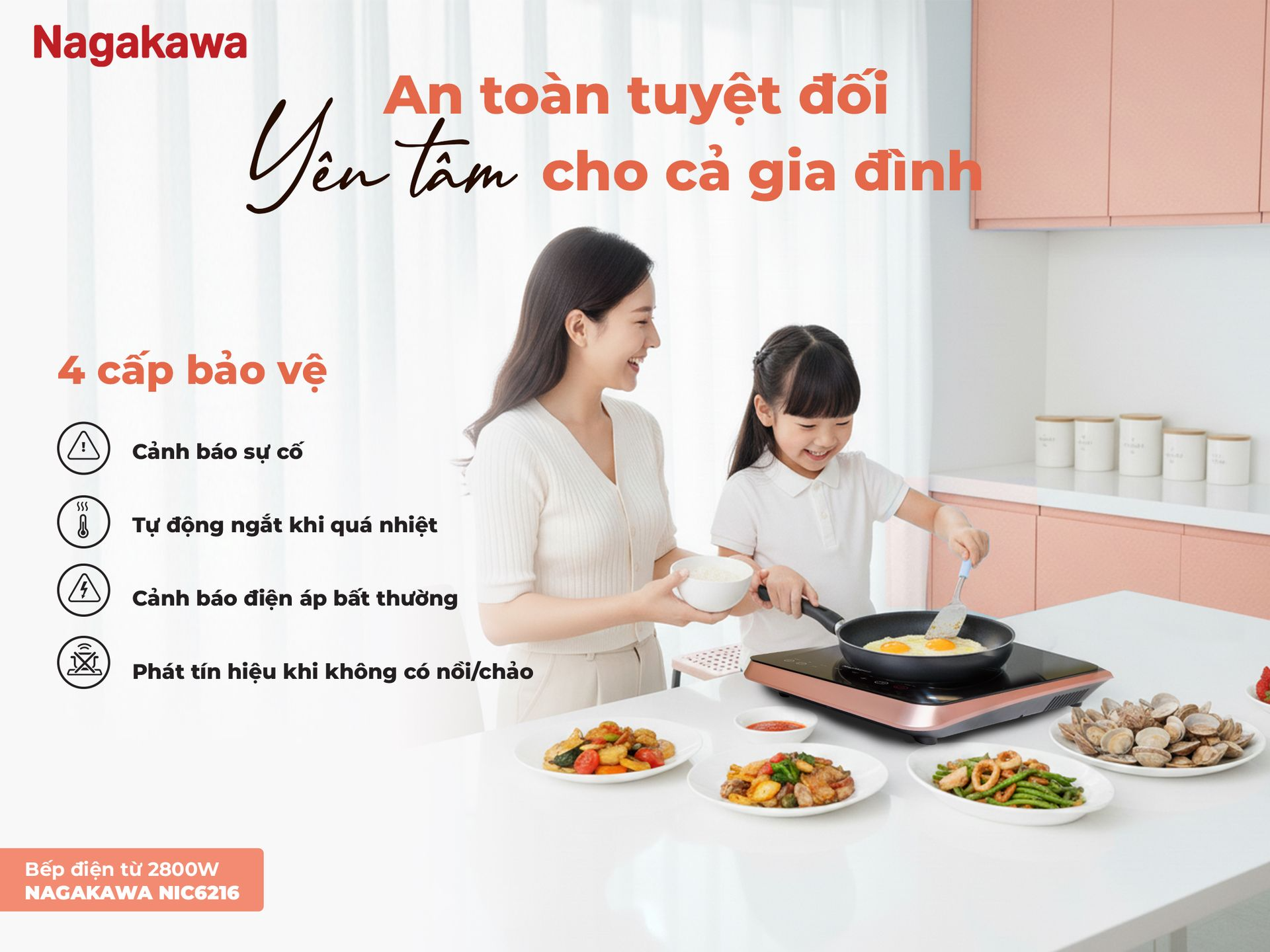 An toàn của gia đình luôn là ưu tiên hàng đầu. Bếp điện từ 2800W Nagakawa NIC6216 được trang bị 4 cấp bảo vệ thông minh: cảnh báo mã lỗi, tự động ngắt khi quá nhiệt, cảnh báo khi điện áp bất thường (quá cao/thấp), và cảnh báo khi không có nồi/chảo. Hệ thống bảo vệ toàn diện này giúp người dùng yên tâm tuyệt đối, đặc biệt phù hợp với gia đình có trẻ nhỏ và người lớn tuổi.