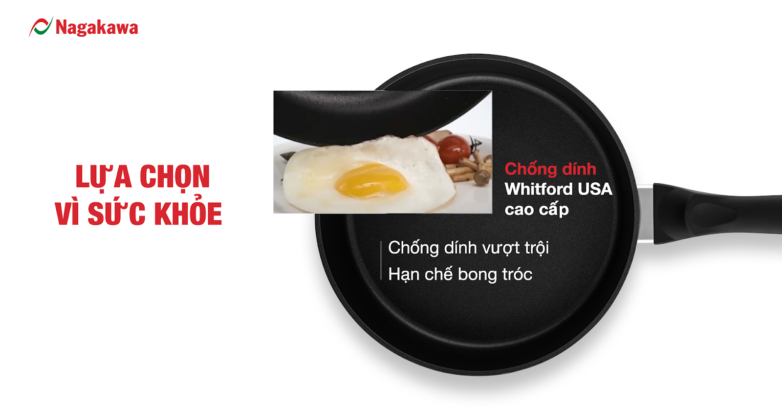 Lòng chảo được phủ lớp chống dính Whitford không chứa PFOA, không thôi nhiễm chất độc hại vào thức ăn, đảm bảo an toàn vệ sinh thực phẩm và an toàn cho sức khỏe người sử dụng.